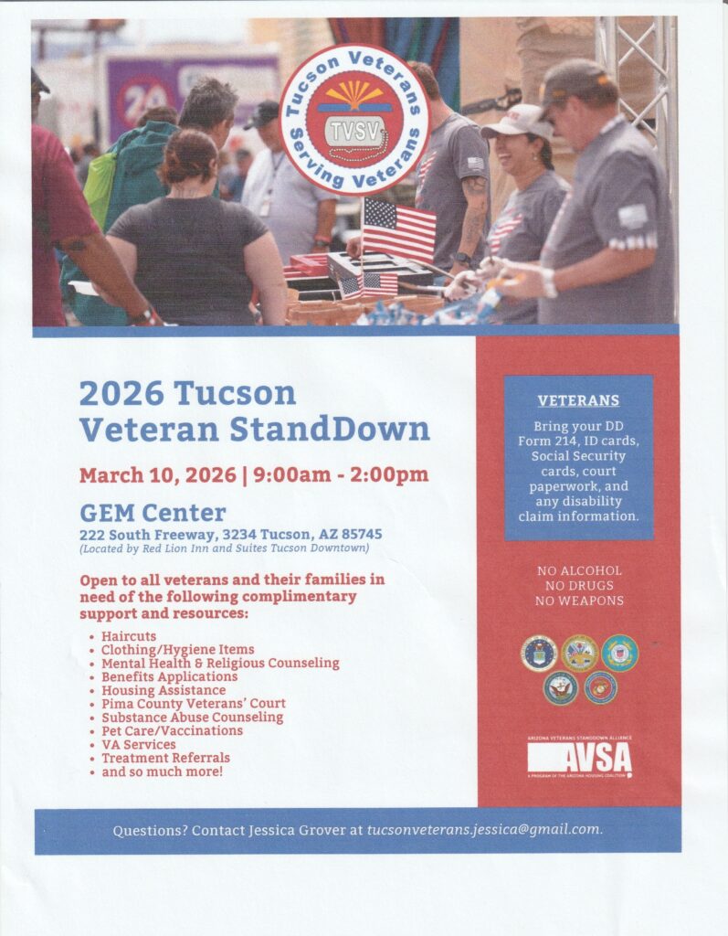 2026 Tucson Veteran StandDown, TOMORROW, March 10th from 9:00am to 2:00pm – see below: March 9, 2026March 9, 2026 Robin DeLozier Vet Resources, Veteran Issues, Veterans