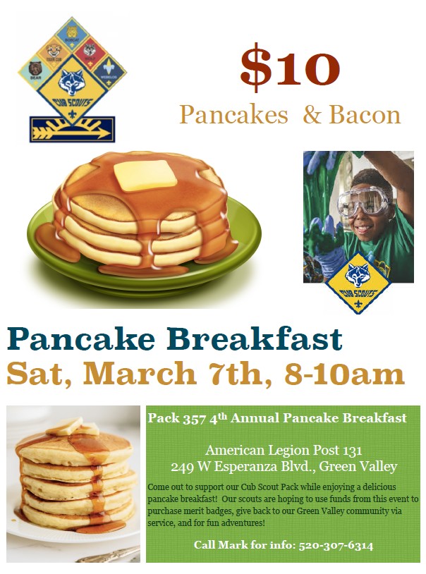 Pancake Breakfast – Saturday March 7th, 8-10am – come support Cub Scout Pack 357’s 4th Annual Breakfast – see below for details